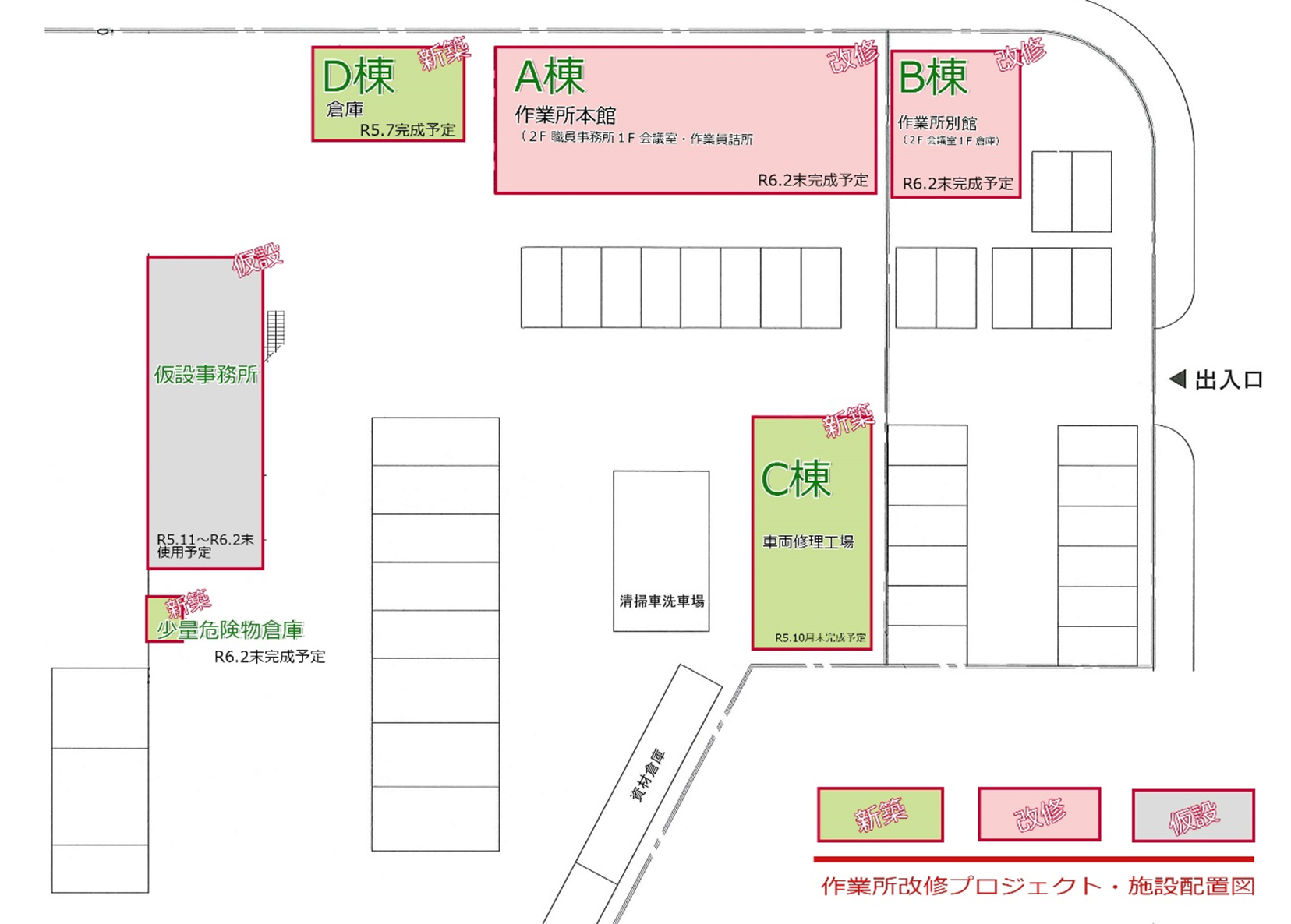 プロジェクトは、既存建物(A棟、B棟)の内外装の近代化と、車両整備工場(C棟)及び倉庫(D棟)の新設から構成されおり、令和6年2月末の完了を予定しています。