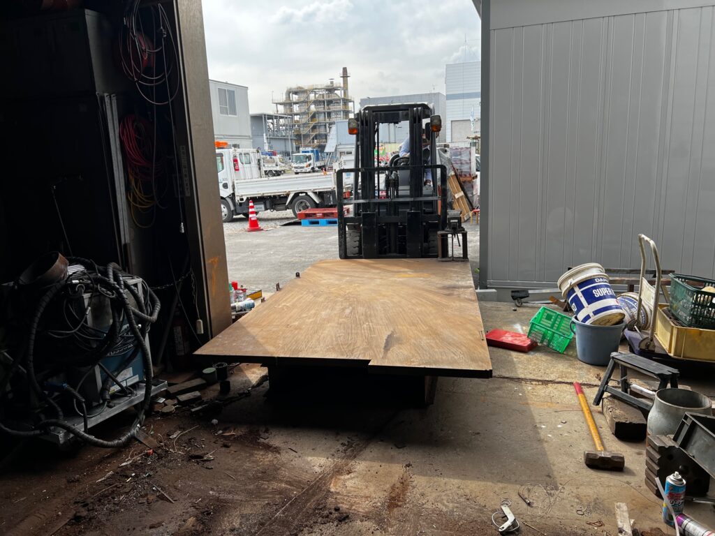移動が一番大変な定盤(約2t)を、C棟が出来るまでの間、外へ仮置き