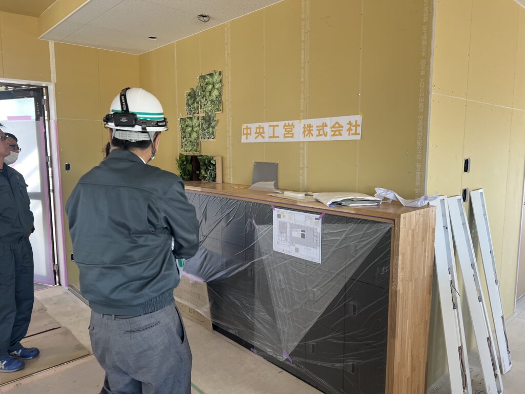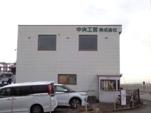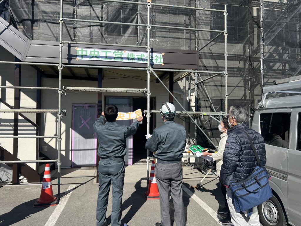 1月下旬にプロジェクトチームで、A棟・B棟に社名の取付位置を確認しました。