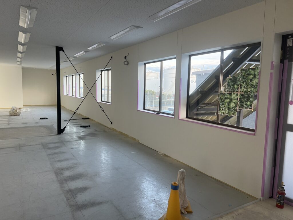 また、足場が撤去され残すは、室内のクロス・OAフロア・電気工事のみとなりました。