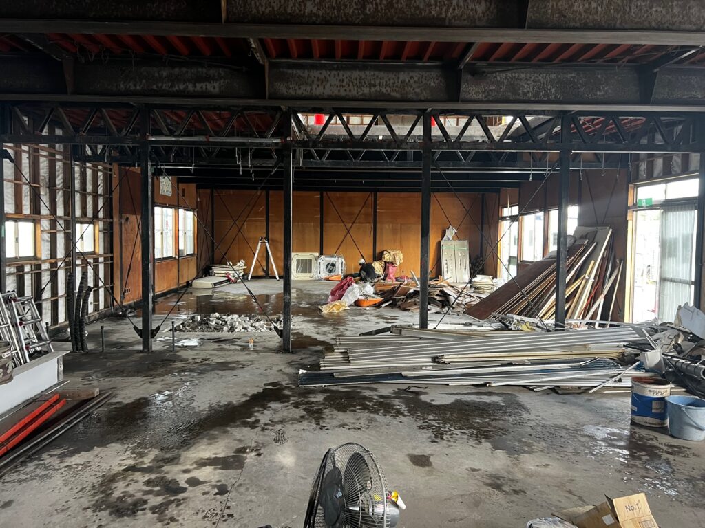 A棟改修・現況確認 A棟は引き続き改修作業中ですが、内装撤去後の鉄骨・木材は、健... -
