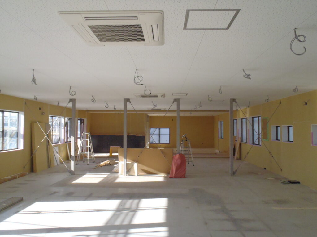 A棟改修 1F・2F壁下地 A棟の1階と2階の壁下地の取付がほぼ完了し、天井の化粧天井... -